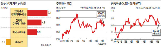 22개 주요 원자재 가격 추이를 보여주는 블룸버그 원자재지수는 상반기 동안 7.1% 올랐다. 같은 기간 전 세계 증시 흐름을 반영하는 모건스탠리캐피털인터내셔널(MSCI) 세계 주가지수 상승률(4.9%)을 웃도는 수치다.
