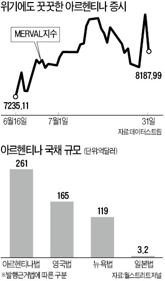 이번에 논란이 된 뉴욕법 관할 아르헨티나의 국채 규모는 119억달러다. 이보다 훨씬 많은 165억달러의 채권이 영국에서 발행됐지만 이들 채권을 보유한 기관이나 개인들은 아르헨티나 정부에 상환을 요구하지 않고 있다.