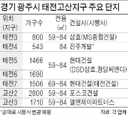 성남~여주 간 복선전철(내년 말 개통), 성남~장호원 간 자동차전용도로(2017년 완공) 등이 잇따라 건설되면서 수도권 남동부 주요 주거지로 떠오르고 있는 경기 광주시. 현대건설 포스코건설 삼호 등 민간 건설사들이 광주시 오포읍 일대에서 10년 만에 1만여가구 규모의 미니신도시 사업을 재개한다.총 부지면적이 120만㎡에 달하는 태전·고산지구다. 건설사들은 이르면 올해 연말부터 아파트 분양에 나설 계획이다.