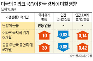 현대경제연구원이 10일 발표한 ‘이라크 공습의 한국 경제 영향과 시사점’ 보고서에 따르면 미국의 이라크 공습을 계기로 중동 지역 불안이 고조돼 국제유가가 상승하면 한국의 경제성장률과 물가상승률 등에도 타격이 불가피할 전망이다. 이라크 등 중동 지역은 세계 최대 원유 생산지로 이 지역의 불안은 국제유가 급등으로 직결되기 때문이다.
