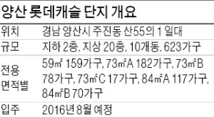 롯데건설은 이달 말 경남 양산시 주진동 일대에서 ‘양산 롯데캐슬’을 분양한다고 10일 밝혔다. 이 아파트는 지하 2층~지상 20층, 10개 동 규모로 지어진다. 전용면적 기준 59㎡ 159가구, 73㎡A 182가구, 73㎡B 78가구, 73㎡C 17가구, 84㎡A 117가구, 84㎡B 70가구 등 6개 타입 623가구다.수요자의 선호도가 높은 중소형으로만 구성되며 분양가는 발코니 확장을 포함해 3.3㎡ 당 600만원대로 책정될 예정이다. 양산시에는 그 동안 물금지역 위주로 공급이 몰렸었다. 이 아파트는 웅상권역에서는 2004년 이후 오랜만에 공급되는 단지여서 수요자들의 관심을 모으고 있다.