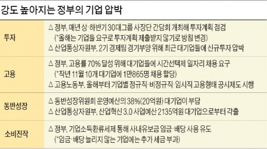 배상근 한국경제연구원 부원장은 “경기부양, 내수진작, 고용창출 등은 정부가 1차적으로 책임져야 할 일”이라며 “최근 상황만 보면 이런 역할을 기업의 자발적 협조 없이 과도하게 떠넘기고 있다”고 지적했다.