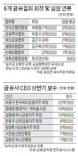 전국은행연합회 등 6개 금융협회 회장들이 평균 5억원 가까운 연봉을 받은 것으로 나타났다. 이들 협회 임원의 평균 연봉도 2억원을 넘었다. 일부 금융지주 회장과 은행장은 올 상반기에만 수십억원의 보수를 받은 것으로 집계됐다.◆금투협회장 연봉 5억여원