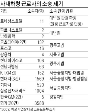 앞서 2010년 현대차 사내하청 근로자 1941명은 현대차를 상대로 정규직 근로자 지위확인 소송을 냈다. 고용노동부에 따르면 현대차 사례처럼 사내하청 근로자가 낸 지위확인 소송 건수는 20여건, 소송 제기 인원은 3000명을 훌쩍 넘는다. 이 중 기아차와 현대하이스코 등은 현대차처럼 특별채용 합의에 도달할 가능성이 높다.