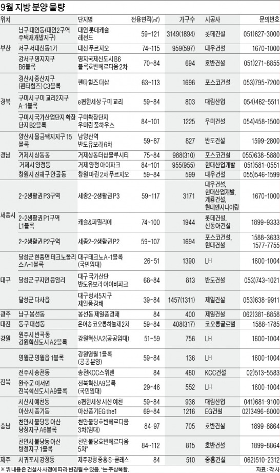 다음달 지방에선 세종시와 부산, 대구, 천안·아산 등지에서 일반분양 아파트만 2만가구 이상 쏟아진다.