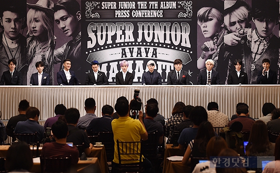 [변성현 기자] 그룹 슈퍼주니어가 28일 오전 서울 논현동 임피리얼 팰리스 호텔에서 정규 7집 'MAMACITA(마마시타)' 발매 기념 기자회견을 갖고 컴백했다.