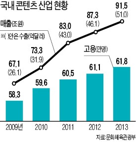 미래부와 문화체육관광부는 지난해부터 콘텐츠산업으로 창조경제를 견인해 국민소득 3만달러 시대를 실현한다는 비전 아래 다양한 정책을 실행 중이다. 2017년까지 콘텐츠산업의 시장 규모를 120조원으로 키우고, 100억달러 수출 달성과 69만명 고용 창출도 이룬다는 목표다.
