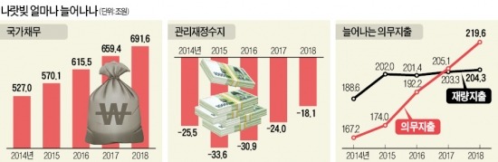 박근혜 정부가 출범하기 직전인 2012년 말 443조1000억원이던 나랏빚이 불과 3년 만에 127조원 늘어나는 셈이다. 여기에 정부가 책임져야 하는 공공기관 부채 523조2000억원(지난해 말 기준)까지 합한 나랏빚은 1093조3000억원으로 국내총생산(GDP·내년 1594조원 전망) 대비 68.6%에 달한다. 마찬가지로 정부가 감당해야 할 비영리 공공기관 부채까지 합한다면 GDP 대비 국가채무는 70%를 넘어설 것이란 전망이 나온다.