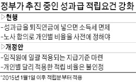 기재부는 그러나 소득세법 시행령에 ‘불특정 다수의 퇴직자에게 일괄적으로 적용되는 지급 기준을 마련해야 한다’는 조항을 추가하기로 했다. 앞으로는 ‘모든 임직원이 똑같은 비율의 성과급을 DC형 퇴직연금에 적립한다’는 기준이 있어야 근소세 면제가 가능하다는 얘기다.
