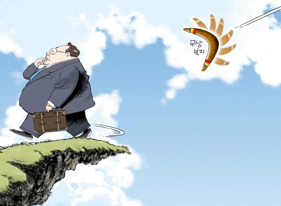 우리 사회를 뜨겁게 달군 ‘무상복지’는 벌써 곳곳에서 ‘재정 고갈’이라는 부메랑으로 돌아오고 있다. 재정(세금)과 복지는 동전의 양면이라는 단순한 진리를 잊은 채 과도한 공짜만을 외친 탓이다. 저수지의 둑 일부가 무너져 마을 앞 하천이 범람해도 무상복지로 재정이 고갈돼 두 손을 놓은 지방자치단체도 있고, 자전거 길을 만드는 공사도 예산 부족으로 곳곳에서 멈춰섰다. 무상교육, 무상급식에 돈을 쏟아부어야 하는 학교도 사정은 마찬가지다. 붕괴 위험이 있는 불안한 학교, 인성교육이 필요한 학생들이 예산 부족으로 그대로 방치되고 있다. 7년 된 고물 PC로 수업하다 이를 참지 못한 학생들이 스스로 부품을 갈아끼우는 학교까지 생겼다. 무상급식의 부메랑으로 초·중·고 원어민 교사도 3년 새 2500여명이나 줄었다. 저소득층을 도울 재원은 갈수록 쪼그라들고 있다.