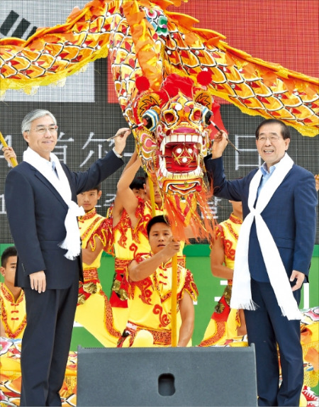 19일 서울시와 주한중국대사관 주최로 서울시청 앞 광장에서 열린 ‘2014 서울-중국의 날’ 행사에서 박원순 서울시장(오른쪽)과 추궈훙 주한중국대사가 용의 눈에 마지막 점을 찍는 ‘화룡점정’ 장면을 연출하고 있다.