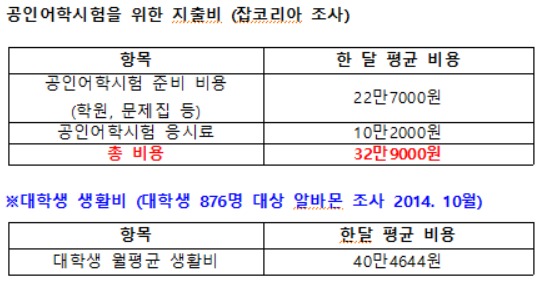 잡코리아 관계자는 “취업준비생들이 공인어학시험에 들이는 이 같은 규모의 비용은 대학생의 한 달 평균 생활비인 약 40만4600원 (아르바이트 사이트 알바몬 조사, 2014년 10월 기준)과 비교할 경우 적지 않는 수준”이라고 분석했습니다. 단순하게 수치만으로 계산해 보면 생활비의 80%가량을 ‘영어’에 투자하는 셈입니다.[아래 표 참조]