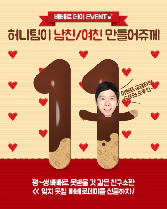 추첨을 통해 총 50명에게는 빼빼로 쿠폰이, 제일 많은 좋아요를 받은 유저에게는 허니스크린에서 직접 준비한 남친/여친 컨셉의 이색 경품이 준비되어 있다.