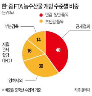 정부는 이번 협상에서 농수산물 보호에 총력을 기울였다는 점을 거듭 강조했다. 이를 위해 중국 수입액의 60%를 관세 철폐 의무가 없는 초민감품목으로 지정했다. 특히 그중 절반인 30%(612개)는 앞으로 어떤 추가 개방 의무도 지지 않는 양허제외 품목으로 지정했다. 쌀을 비롯해 보리 마늘 양파 고추 사과 배 소고기 돼지고기 조기 갈치 등이다.