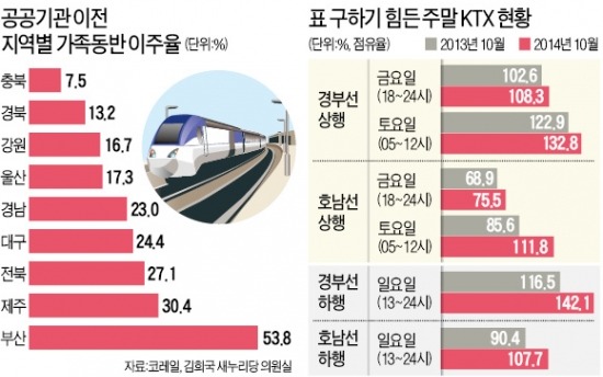 정부의 공공기관 이전계획에 따라 151개 기관 임직원 5만여명은 2016년까지 10개 지방혁신도시로 내려가게 된다. 지난해부터 지난달 말까지 68개 공공기관이 이전을 완료했다. 이전율은 45%다. 애초 정부는 공공기관을 이전하면 기혼 직원의 절반가량은 가족과 함께 이주해 지역경제 활성화에도 도움이 될 것으로 전망했다. 하지만 현실은 달랐다. 교육·생활환경이 열악하고 문화 인프라가 갖춰져 있지 않은 탓에 기혼 직원들의 가족 동반 이주율은 20%가 채 안 됐다. 현재까지 이주한 2만여명 중 1만5000명 이상이 주말에 상경함에 따라 KTX 좌석 점유율이 100%를 크게 웃도는 상황이다.