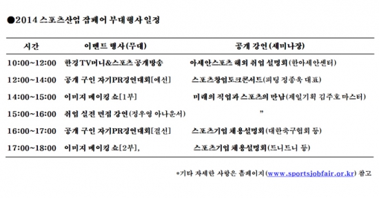 행사는 오전 10시 개막식을 시작으로 오후 6시까지 운영되며, 스포츠분야 취업과 창업 희망자라면 누구나 무료입장 가능하다. 기타 자세한 사항은 홈페이지(www.sportsjobfair.or.kr)를 참조하면 된다.