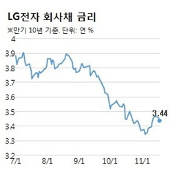연 3.79%의 금리는 LG전자가 지난 7월 발행한 12년 만기 회사채 금리인 연 3.95%보다 더 낮은 수준이다. 이번 채권의 만기가 직전 채권보다 2년 더 긴데도 이자를 덜 내게 된 셈이다. 7~11월 시장 금리가 큰 폭으로 떨어진 것을 감안해도 매우 유리한 조건으로 자금을 조달했다는 평가다.