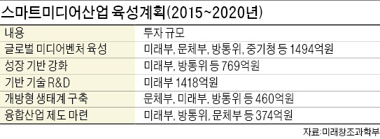방송과 ICT를 결합한 스마트미디어 서비스는 최근 인터넷 스트리밍 동영상 서비스, 가상현실을 체험하는 실감미디어, 정보와 광고를 결합한 디지털 사이니지 서비스 등으로 발전하고 있다. 정부는 내년부터 2020년까지 6년간 융합 기술 개발, 벤처 지원 등에 4515억원을 투자하기로 했다. 글로벌 미디어 벤처 육성과 기반기술 연구개발에만 3000억원 가까이 투입한다. 혁신적인 스마트미디어 서비스를 앞서 개발하고 누구나 콘텐츠를 제작해 서비스할 수 있는 개방형 생태계를 조성해 나간다는 계획이다.