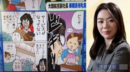 9일 일본의 한 방송은 조현아 부사장이 땅콩 기내 서비스 때문에 승무원 사무장을 이미 출발한 항공기에서 내리게 한 사건을 만화로 표현했다.