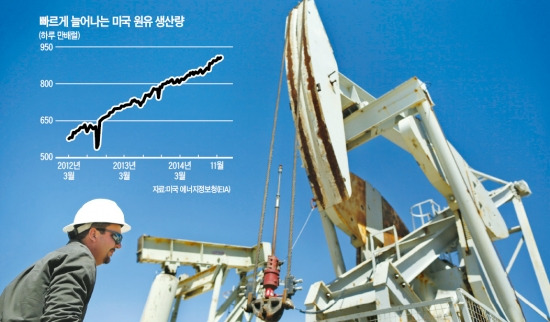 전문가들은 그러나 유가 폭락의 이면에 글로벌 에너지 패권을 쟁탈하려는 미국과 사우디의 ‘치킨게임’이 자리하고 있다고 해석했다. 2008년 미국 텍사스 등에서 본격적으로 생산되기 시작한 셰일오일은 6년 만에 하루 생산량이 당시 470만배럴의 두 배에 가까운 890만배럴까지 늘었다. 미국 에너지정보청(EIA)은 내년에는 930만배럴까지 올라설 것으로 전망했다. 세계 최대 산유국인 사우디의 생산량(975만배럴)과 비슷한 수치다.