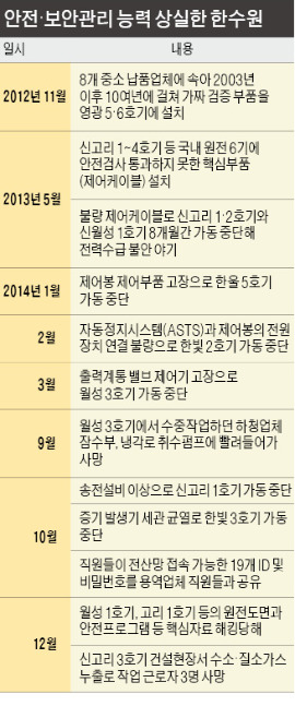 최근 2년 새 한국수력원자력에서 줄줄이 발생한 사건·사고 리스트다. 해킹으로 원전 도면 등 핵심자료가 유출된 사건이 오리무중인 가운데 이번엔 내년 6월께 준공을 앞둔 신고리 원전 3호기 건설현장에서 근로자 3명이 숨졌다. 이를 포함해 올 들어서만 원전 현장에서 6명이 사망했다. 이처럼 설비유지 관리와 안전·보안 관리에 구멍이 숭숭 뚫린 한수원의 총체적 부실은 원전에 대한 국민 신뢰를 훼손하고 국가의 ‘에너지 백년대계’까지 위협한다는 지적이다.
