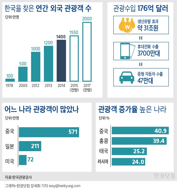 외국 관광객이 늘어나면서 올해 관광수입은 176억 달러에 이를 것으로 추정된다. 관광수입이 국내 경제에 미치는 생산유발 효과는 약 31조 원이다. 휴대전화 3700만대, 중형 자동차 47만대를 수출한 것과 같은 효과라고 관광공사 측은 설명했다.