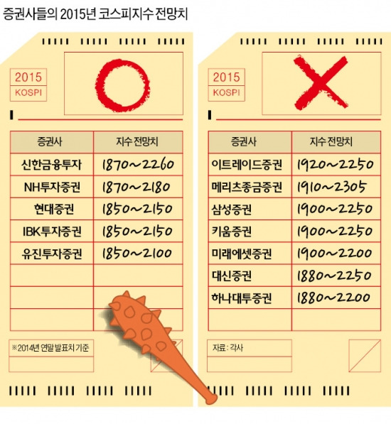 증권사들의 잘못된 예측은 지난해에도 마찬가지였다. 한국투자증권, 하나대투증권, 대신증권, 미래에셋증권, 메리츠종금증권, 토러스증권 등이 코스피지수 하단을 1950 이상으로 예측했다가 개장 후 이틀 만에 지수 하단이 뚫리며 수모를 당했다.