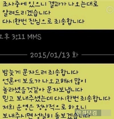 해당 게시물에는 "밤 늦게 문자 드려 죄송합니다. 언론에 보도가 나오고 해서 많이 놀라셨을 것 같아 문자 보냅니다"라면서 "믿고 보내주셨는데 다시 한번 죄송합니다. 저희 운영은 정상적으로 하오니 보내주시면 성실히 돌보겠습니다"라는 문자 메시지를 캡처한 사진이 포함돼 있다.