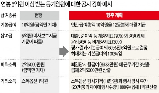 상장사 등기임원 중 연봉 5억원 이상 수령자는 2013년 기준 700여명이다. 기업공시 서식을 위반한 상장사는 과징금 등 행정처분을 받는다. 대부분 상장사는 상여금 산정에 대해 ‘임원처우규정(이사회 결의)에 따름’ 정도로 간략하게 적고 있다.