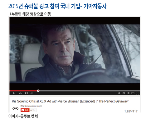 슈퍼볼 광고 한 건당 가격은 1966년(1회 슈퍼볼) 4만2000달러에서 지난해 400만 달러까지 상승했다. 올해는 450만 달러로 매년 광고비가 상승하고 있다. 국내 기업 중 슈퍼볼 광고에 참여한 기업은 '기아자동차' 한 곳이다. 기아자동차는 피어스 브로스넌 주연으로 '뉴 쏘렌토'를 광고했다.