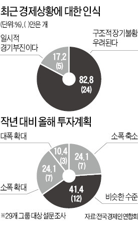 현 경제 상황을 어떻게 보느냐는 질문에 24개 그룹(82.8%)이 ‘구조적 장기 불황이 우려된다’고 답했다. ‘일시적 경기 부진’이라고 답한 곳은 5개 그룹(17.2%)에 그쳤다. 2008년 글로벌 금융위기와 비교해 현 경영 환경이 어떤지를 묻는 질문에는 16개 그룹(55.2%)이 ‘더 나쁘다’고 답했다. ‘비슷하다’는 의견은 5곳(17.2%), ‘좋아졌다’는 의견은 8곳(27.6%)이었다.
