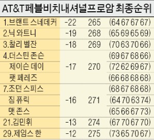 스네데커는 16일(한국시간) 페블비치 골프링크스코스(파72·6816야드)에서 열린 대회 마지막 라운드에서 버디만 5개를 잡는 깔끔한 플레이로 5언더파 67타를 쳤다. 최종합계 22언더파 265타를 기록한 스네데커는 2위 닉 와트니(미국·최종합계 19언더파 268타)를 3타 차로 가볍게 따돌리고 1위에 올랐다.