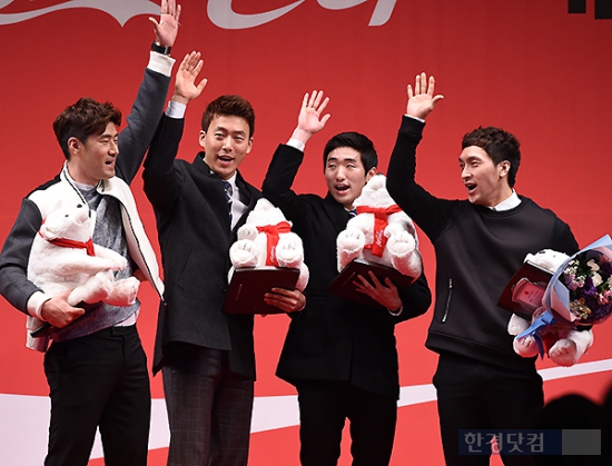 [변성현 기자] '2014 인천아시안게임' 펜싱 남자 에페 단체전 금메달리스트 정진선, 박경두, 박상영, 권영준이 24일 오후 서울 소공동 웨스틴조선호텔에서 열린 '제20회 코카-콜라 체육대상' 시상식에 참석해 우수단체상을 수상한 후 화이팅을 외치고 있다.