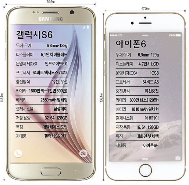 화면 크기는 갤럭시S6와 갤럭시S6 엣지 모두 5.1인치. 아이폰6(4.7인치)와 아이폰6플러스(5.5인치)의 중간이다. 아이폰6플러스는 너무 커서 들고 다니기 불편하다는 불만이 나왔다. 아이폰6의 화면 크기는 모호하다는 지적이 있었다. 이런 약점을 정확히 파고들었다.