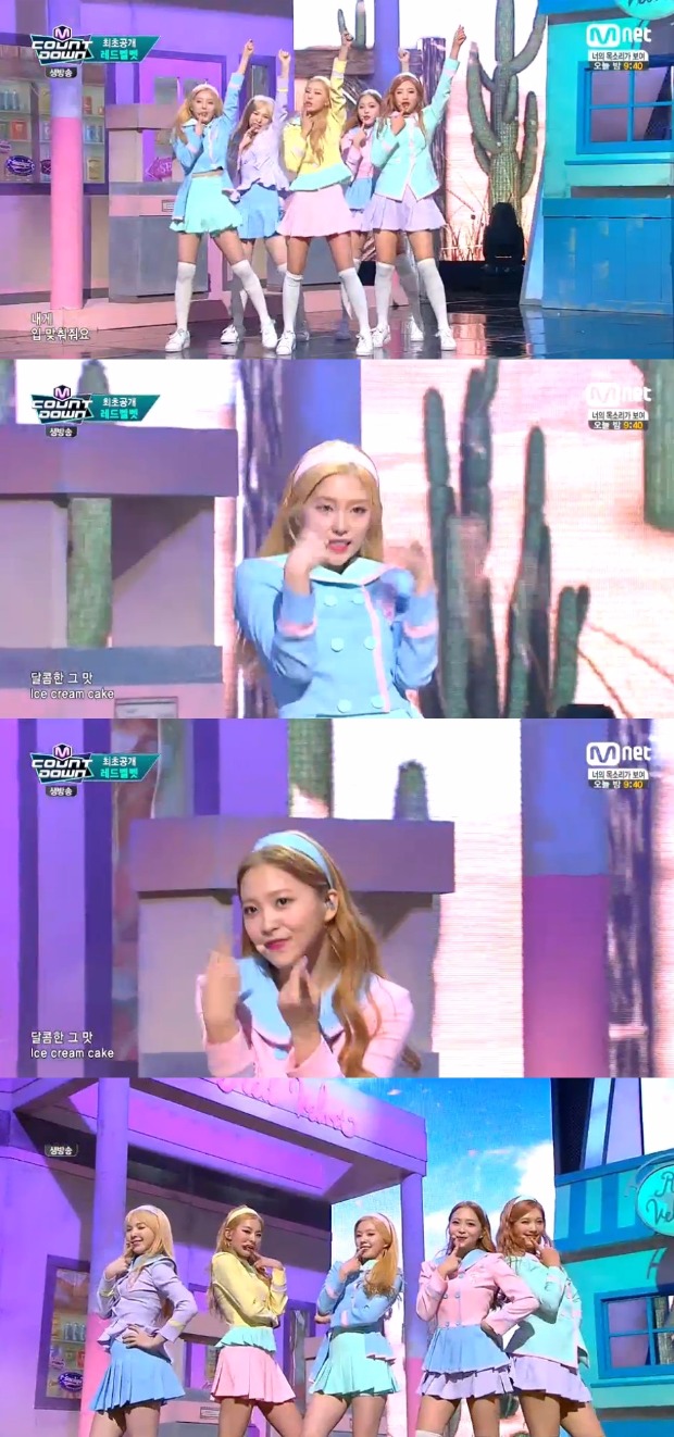 레드벨벳은 19일 오후 방송된 케이블채널 Mnet 음악프로그램 '엠카운트다운'에서 이번 미니앨범의 타이틀곡 '아이스크림 케이크'의 첫 무대를 선보였다.