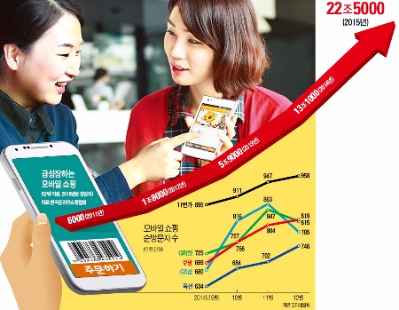 대한상공회의소는 23일 발간한 ‘2015년 유통산업 백서’에서 지난해 모바일 쇼핑 매출이 13조1000억원으로 집계됐다고 밝혔다. 전년보다 122.0% 증가하 庸?처음으로 10조원을 넘어섰다. 2011년 6000억원에서 3년 만에 22배가 됐다. 국내 최대 유통업체인 롯데백화점의 지난해 매출(14조2000억원)과 비슷한 규모다. 올해는 모바일 쇼핑 시장 규모가 22조원에 이를 것으로 업계에서는 전망하고 있다.