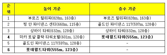 롯데월드타워 100층 돌파는 국내 첫 기록이자, 층수를 기준으로 전 세계에서 완공된 빌딩들과 비교했을 때 10위에 해당한다. 예정대로 2016년 말 완공이 되면 층수로 전 세계 4위, 높이 기준으로는 세계 6위의 초고층 빌딩이 된다.