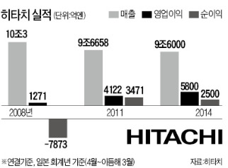 소셜 이노베이션은 히타치가 갈 길을 뜻한다. 히타치는 2008년만 해도 반도체, TV, 가전 등을 주력으로 했다. 글로벌 금융위기가 터진 그해 7873억엔(당시 환율 기준 약 10조2000억원)의 적자를 냈다. 일본 제조업체가 기록한 연간 최대 순손실이었다. 이후 히타치는 살기 위해 변신을 꾀했다. TV와 가전 등 주력사업을 버렸다. 대신 인프라 시스템, 정보·통신 시스템, 전력 시스템 등 이른바 인프라 사업을 주력으로 삼았다. 이를 통해 사회 혁신에 기여하자는 취지였다. 히타치의 지난 회계연도(2014년 4월~2015년 3월) 영업이익은 5800억엔으로 추정되고 있다. 사상 최대다.