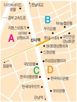 A지역은 강남대로변으로 더 리버사이드 호텔과 의료관련 업종, 오피스 등으로 이루어진 상권이다. 이를 바탕으로 이면에는 주5일 먹자 상권이 형성되어 점심,저녁 시간 유동인구가 상당하다. 빌딩 매매 사례로는 4층 건물이 2014년 7월 평당 3,716만원에 매매되었다.B지역은 신사동 최고의 상권인 가로수길, 세로수길이 위치한 지역이다. 가로수길은 압구정 로데오 거리, 청담동 갤러리 거리처럼 문화와 쇼핑이 어우러져 지역의 특수성을 형성해 가며 활성화되고 있는 거리이다. 가로수길은 1980년대 중반 새마을 지도자들이 자발적으로 심은 은행나무를 통해서 가로수길이라는 명칭을 얻게 되었다. 가로수길을 중심으로 이면거리들은 세로수길이라 불리며 먹자 상권, 카페 등을 중심으로 활발하게 성장하고 있다. 빌딩 매매 사례로는 7층 건물이 2013년 2월 평당 4,892만원에 매매되었다.