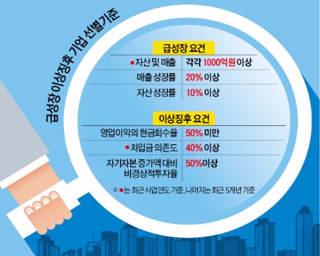 금감원이 분류한 이상징후 기업은 최근 사업연도 매출과 자산이 모두 1000억원 이상이면서 상대적으로 빠른 속도(최근 4년간 ?知?매출성장률 20%·자산성장률 10% 이상)로 성장 중인 외부감사대상법인이다. 구체적으로 △영업이익의 현금회수율이 50% 미만 △금융회사 차입금 의존도 40% 이상 △자기자본 증가규모 대비 비경상적 투자(장·단기 대여금 등) 규모 50% 이상인 기업이 대상이다.