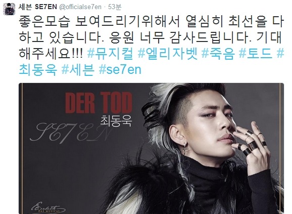 세븐은 6월 막이 오르는 뮤지컬 '엘리자벳'에서 JYJ의 시아준수(본명 김준수)가 연기해 호평받은 판타지 캐릭터 '죽음'을 연기할 예정이다.