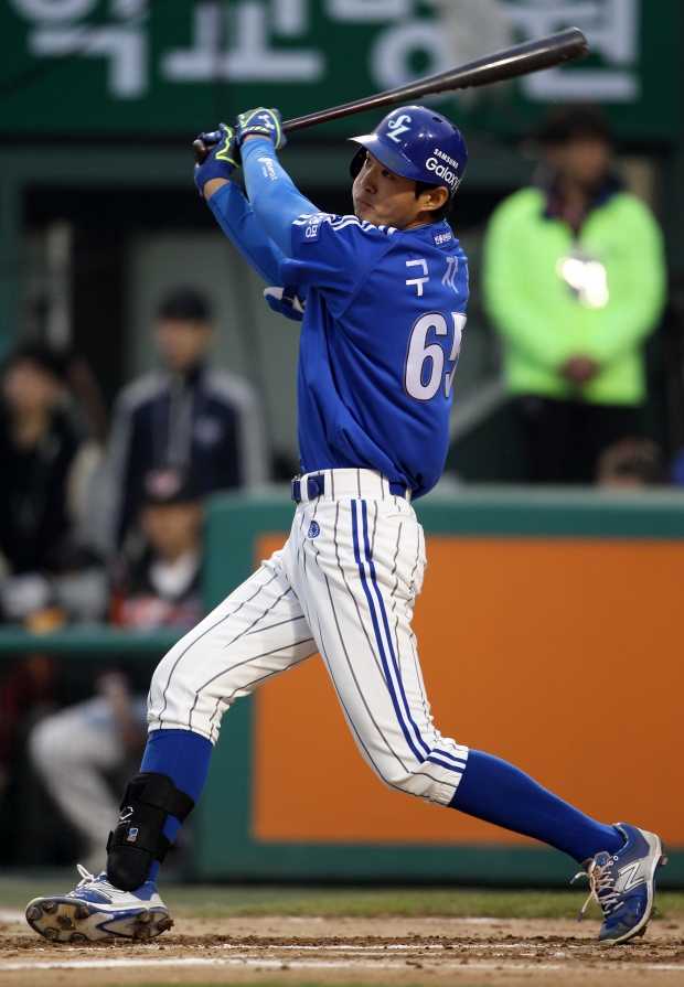 지난 15일 오후 대전 한화생명이글스파크에서 열린 `2015 타이어뱅크 KBO 리그 프로야구` 한화 이글스와 삼성 라이온즈의 경기 삼성 2회초 1사 1,3루에서 7번 구자욱이 좌익수 희생플라이를 날리고 있다.