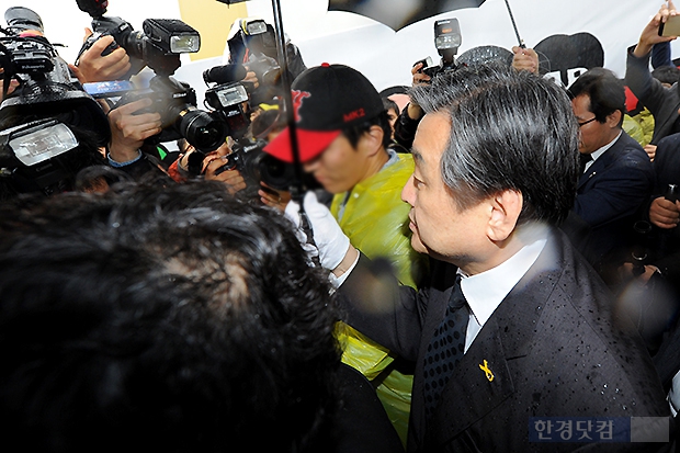 [변성현 기자] 김무성 새누리당 대표가 세월호 참사가 일어난지 만으로 일 년이 되는 16일 오후 경기도 안산시 단원구 세월호 희생자 정부 공식 합동분향소를 찾아 조문하려 했으나 유족에 반대에 막혀 분향소를 빠져나오고 있다.