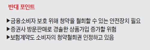 증권사 방문판매 규제가 완화되면 금융투자상품에 큰 관심이 없거나, 관심은 있어도 내용을 잘 모르는 사람들을 지금보다 더 쉽게 유인할 수 있게 된다. 가뜩이나 정보의 비대칭성이 심한 게 금융투자상품인데 소비자의 청약 철회권마저 박탈하는 것은 타당하지 않다. 청약 철회권을 배제하면 소비자에게 경솔한 선택을 하게 한 금융회사의 책임은 쏙 빠지고 그 위험을 고스란히 소비자가 져야 하는 문제가 생긴다.