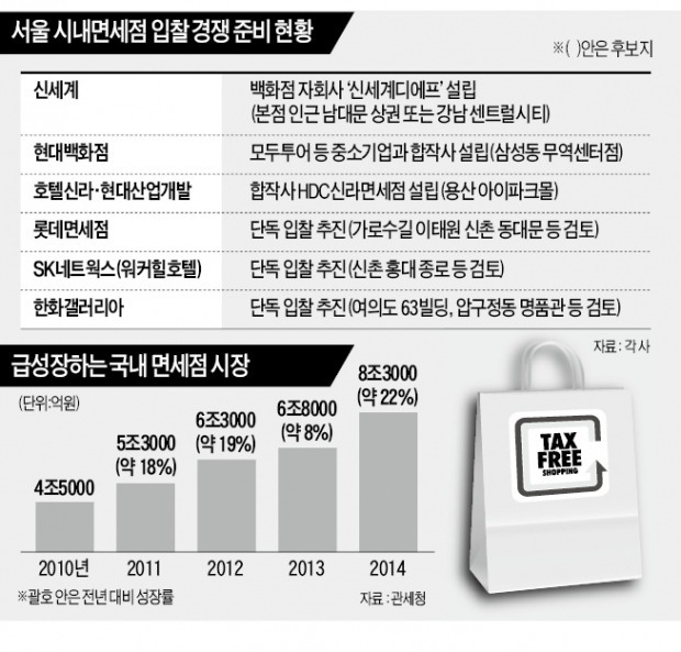 업계에서는 입찰 마감 때까지 이들 기업 간 물밑경쟁이 치열해질 것으로 보고 있다. 백화점과 대형마트 등 기존 유통채널의 성장이 멈춘 데 반해 면세점은 신성장동력으로 떠오르고 있다. 관세청에 따르면 국내 면세점 시장은 2010년 4조5000억원에서 2011년 5조3000억원, 2012년 6조3000억원, 2013년 6조8000억원, 2014년 8조3000억원으로 급신장하고 있다. 관광객이 늘어나면서 올해는 10조원을 넘어설 것이라는 전망이 나온다.