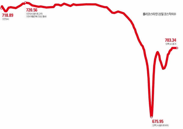 [ 김동욱 / 이고운 기자 ] 올 들어 쉼 없이 30% 넘게 급등한 코스닥시장을 바라보는 투자자들의 불안심리가 적나라하게 드러난 하루였다. 코스닥지수는 22일 장중 최고치와 최저치 차이가 45포인트나 벌어질 정도로 크게 출렁였다. 장 초반 7년4개월 만에 지수 720선을 돌파했지만 오후 한때 5.39% 폭락하는 등 전형적인 ‘롤러코스터’ 장세를 연출했다.