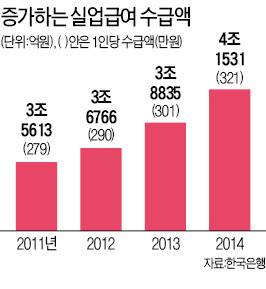 작년 실업급여 지급액이 증가한데는 금융 통신업종의 명예퇴직 여파가 컸다. 작년 한 해 증권 선물 자산운용사 등 금융투자회사의 직원 수는 3413명(7.1%) 줄었다. KT도 임직원 8000여명을 줄였다. 이로 인해 작년 실업급여 수급자 수(129만6505명)는 2013년(129만686명)보다 5819명 늘었다. 재취업 사실을 숨기는 등의 방법으로 실업급여를 받는 부정수급자들이 증가한 것도 원인으로 꼽힌다. 고용노동부가 집계한 지난해 실업급여 부정수급액은 131억원, 부정수급자는 2만2126명에 달했다.