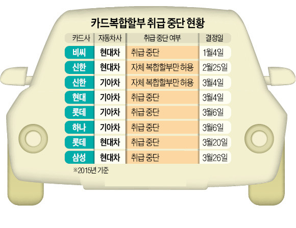 기존 복합할부는 소비자가 카드로 차값을 결제하면 캐피털사가 대금을 1~2일 만에 대신 갚아주고 소비자로부터 매달 할부금을 받는 방식이다. 카드사가 가맹점 수수료를 캐피털사와 나눠 할부금리를 1%포인트가량 낮췄다.