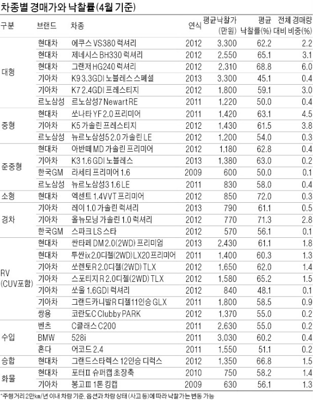 에쿠스, 제네시스, 그랜저 등 대형 차종의 4월 자동차 경매 출품비중은 전체의 14.2%다. 중형인 YF쏘나타와 K5 역시 각각 9.0%와 4.5%를 기록했다. 준중형 차량인 아반떼MD가 3.0%, 소형인 엑센트가 1.5%인 것과 비교하면 세 배가량 차이가 난다. 물량이 많음에도 중·대형차의 최근 낙찰률은 65%에 이른다. 그만큼 수요가 많다는 의미다.