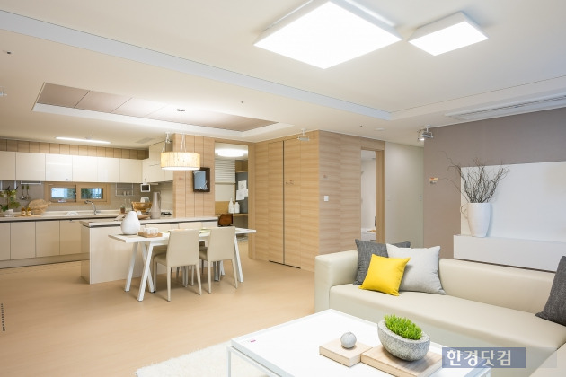 주방과 욕실 등의 수납장 상단 부분을 띄우거나 곳곳에 글라스, 유리 등을 배치해 인테리어 효과를 더했다. 전반적인 컬러도 차분하게 톤 타운을 시켰다. 이전 단지와는 다른 북유럽 스타일의 감성을 더했다는 설명이다.